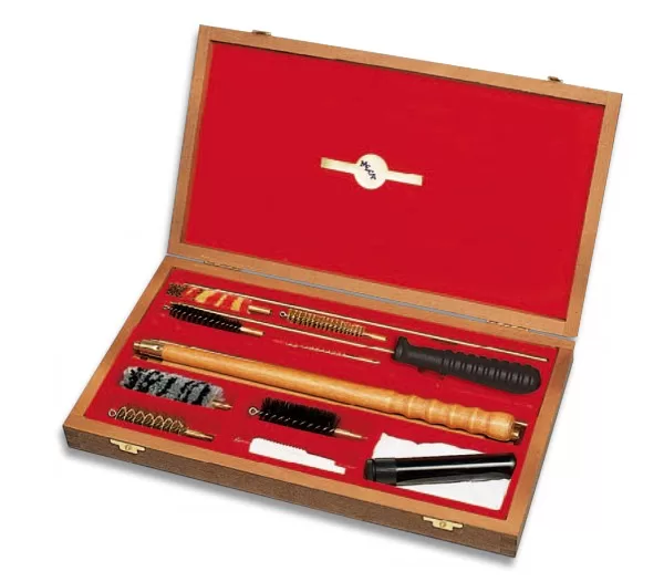 • Kit con 3 barras limpiadores de madera barnizada, otras 3 barras en latón, 3 cepillos de escopeta, 3 cepillos de rifle, 2 puntas, paño abrillantador y frasco para el aceite