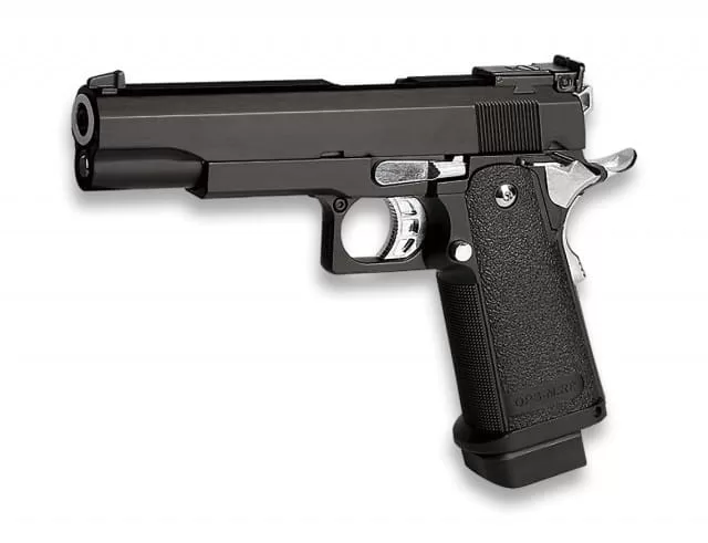 Pistola para airsoft de GOLDEN EAGLE, HI CAPA 5.1, con accionamiento a gas y hop up ajustable, en color negro.Construida en metal y polímero, monta una estructura, cañón y corredera metálica. La empuñadura está rematada con unas cachas de plástico, con diseño granulado, para aumentar el agarre, sujeto al cuerpo del arma por medio de tornillos hexagonales, en ambos lados. Dotada de blowback para otorgarle un mayor realismo.